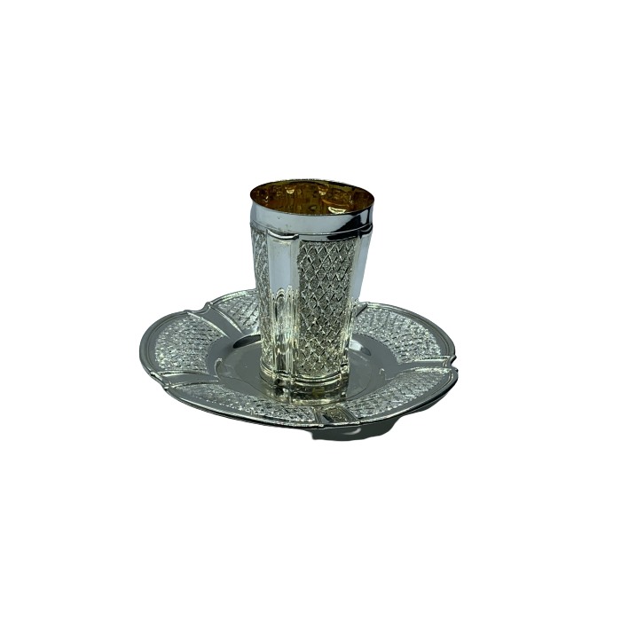 Verre de kidouch et son assiette en argent massif 925 poinçonné garantie d'état de grande taille avec motif effet diamant pour une table de Chabbat ou des fêtes encore plus jolie. Idéal pour un cadeau Bar-mitsvah ou mariage. Poids approximatif 256gr, hauteur du verre 10cm, diamètre assiette 18cm.
