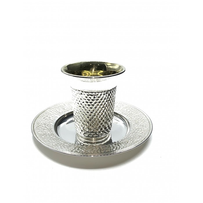 Verre de kidouch et son assiette en argent massif 925 poinçonné garantie d'état de taille moyenne style martelé pour une table de Chabbat ou des fêtes encore plus jolie. Idéal pour un cadeau Bar-mitsvah ou mariage. Poids approximatif 134gr, diamètre assiette 15cm.