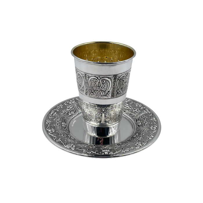 Verre de kidouch et son assiette en argent massif 925 poinçonné garantie d'état de taille moyenne motif baroque pour une table de Chabbat ou des fêtes encore plus jolie. Idéal pour un cadeau Bar-mitsvah ou mariage. Poids approximatif 107gr, hauteur du verre 9cm, diamètre assiette 13cm.