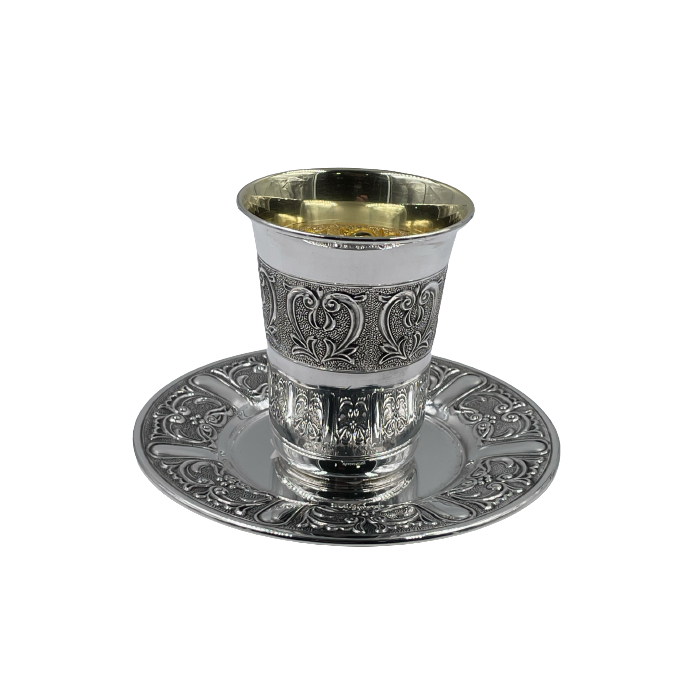 Verre de kidouch et son assiette en argent massif 925 poinçonné garantie d'état de taille moyenne motif baroque pour une table de Chabbat ou des fêtes encore plus jolie. Idéal pour un cadeau Bar-mitsvah ou mariage. Poids approximatif 95gr, hauteur du verre 8,5cm, diamètre assiette 13cm.