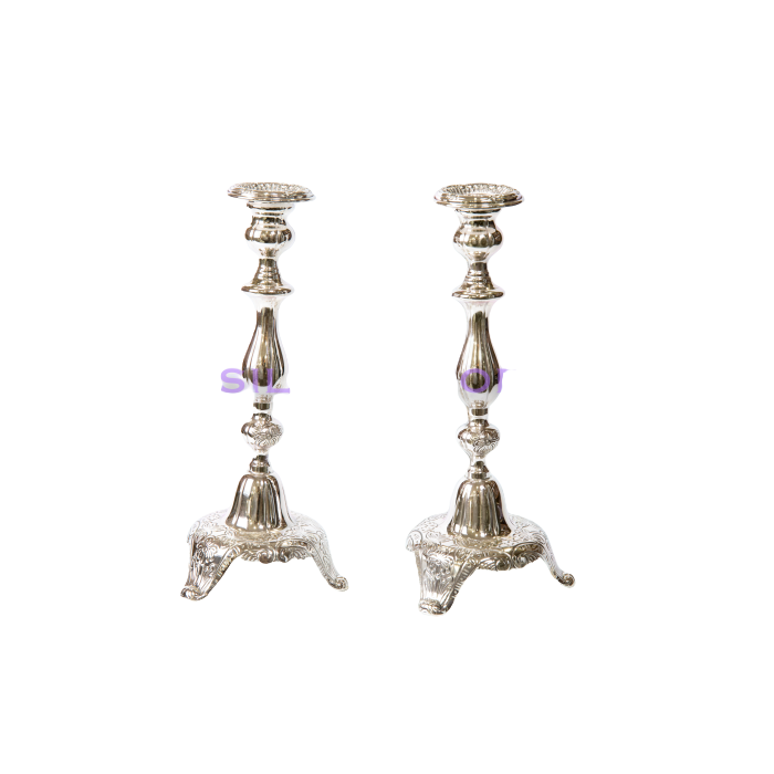 Paire de bougeoirs argent massif 925, copie des bougeoirs de la Rabbanite Haya Mouchka, épouse du Rabbi de Loubavitch, poinçon garantie d'état, hauteur 21cm pour le petit modèle et 33cm pour le grand modèle, poids approximatif 270gr pour le petit modèle et 700gr pour le grand modèle, Hazorfim.