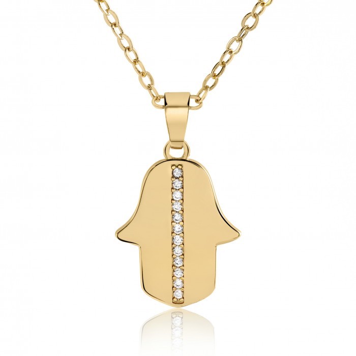 Pendentif Hamsa fantaisie en métal coloris or et incrusté de pierres brillantes avec sa chaine