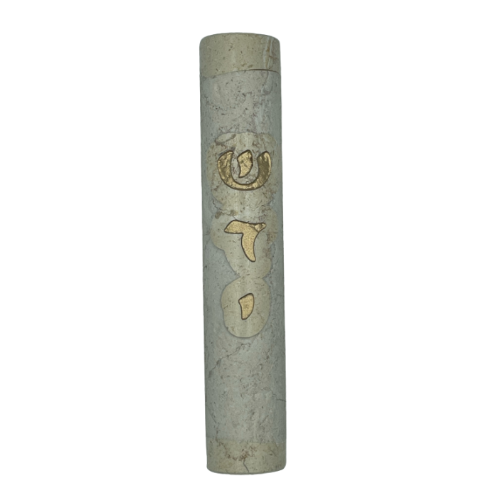 Elégant boitier mezouza en pierre de Jérusalem style épuré design forme arrondie, lettres "shine, dalet, youd" petit caractère en or gravées sur la pierre, pour parchemin de 12cm.