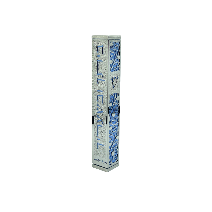 Boitier mezouza design en métal pour parchemin 12cm, coloris bleu et argent. Hadarya.