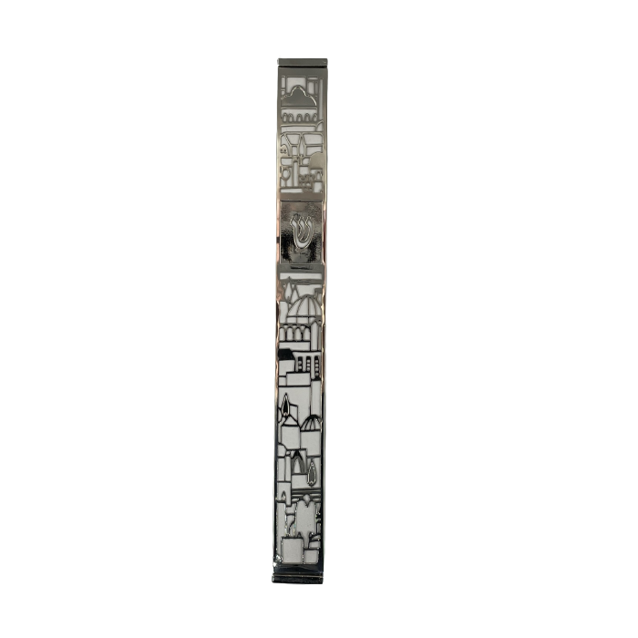 Grand boitier mezouza design au motif de Jérusalem en aluminium pour parchemin de 20cm, coloris argent et fond blanc.