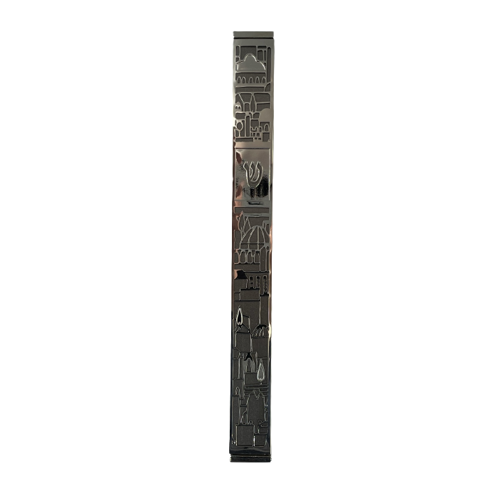 Grand boitier mezouza design au motif de Jérusalem en aluminium pour parchemin de 20cm, coloris argent et fond gris.