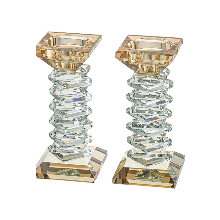 Coffret comprenant verre de kidouch, paire de bougeoirs et un plateau, en cristal. Coloris transparent et or.