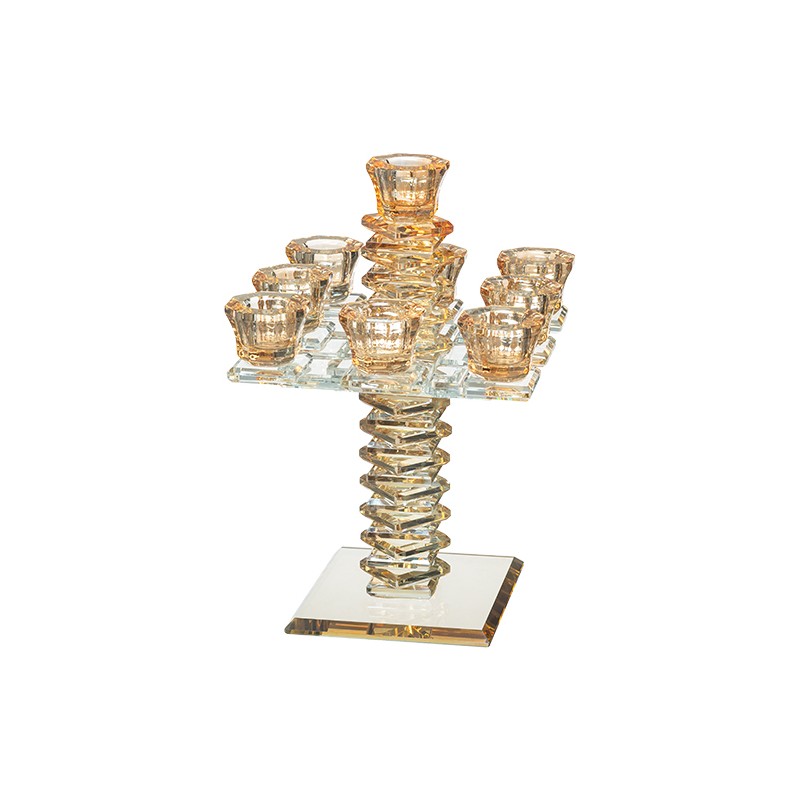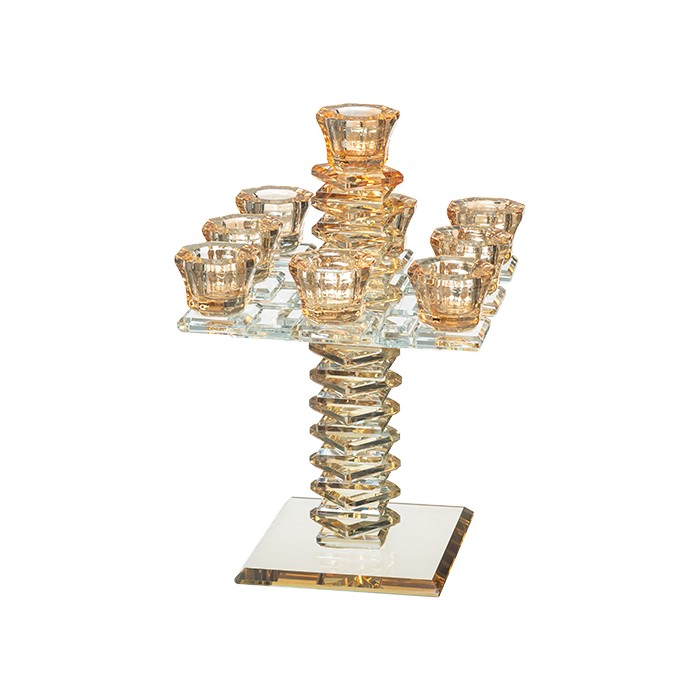Coffret comprenant verre de kidouch, paire de bougeoirs et un plateau, en cristal. Coloris transparent et or.