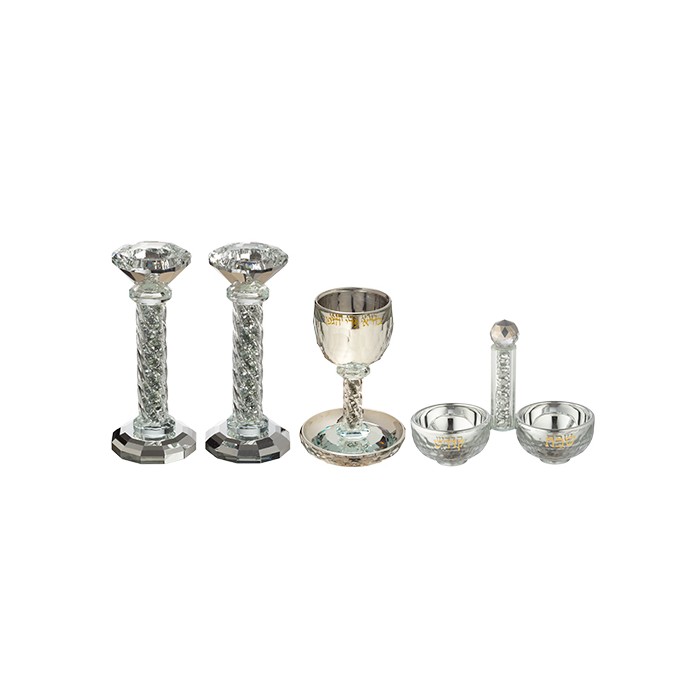 Coffret comprenant verre de kidouch, paire de bougeoirs et une salière, en cristal. Art Judaica.