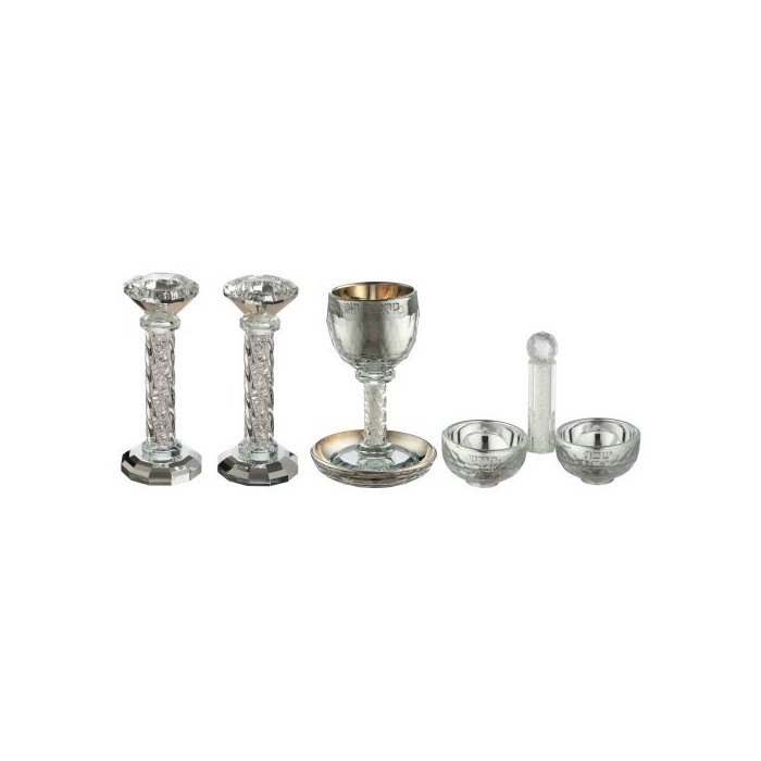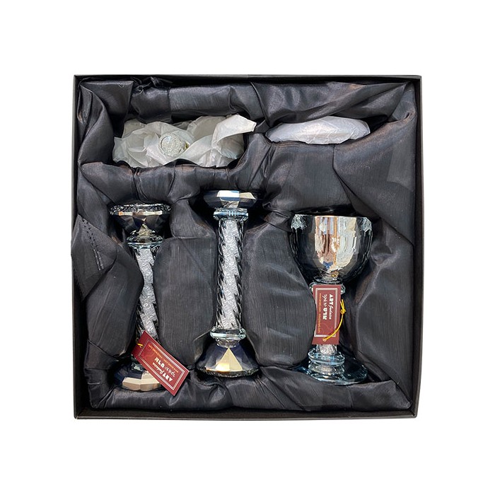 Coffret comprenant verre de kidouch, paire de bougeoirs et une salière, en cristal. Art Judaica.