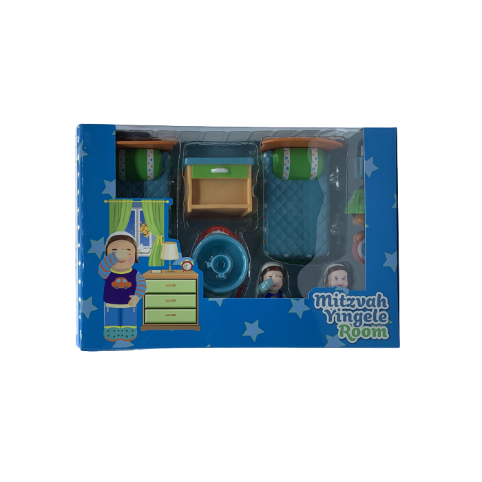 Décor d'une chambre type hassidique d'un petit garçon. La boite contient deux lits, un chevet, un tapis, une horloge, un réveil, une boite de mouchoirs, deux personnages, un neguel vasser. De quoi jouer et inventer des scénarios entre garçons. A partir de 3 ans.