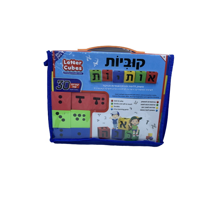 Très belle valisette de 30 cubes Multi-couleurs en mousse alef beth pour une meilleure protection de votre enfant. Compris lettres et voyelles. Cubes faits pour durer dans le temps, toucher agréable et jeu amusant. Cubes légers. Et votre enfant est déjà prêt à la lecture de la langue hébraïque.