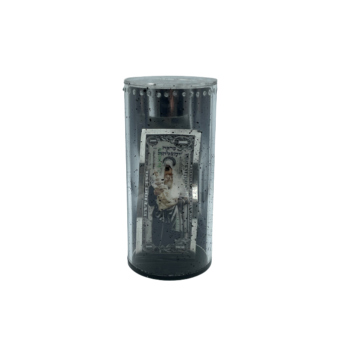 Boite de tsedaka plexiglass avec Dollar du Rabbi 1 Dollar et fond or, dimensions hauteur 15 diamètre 7cm, Alain Mimouni