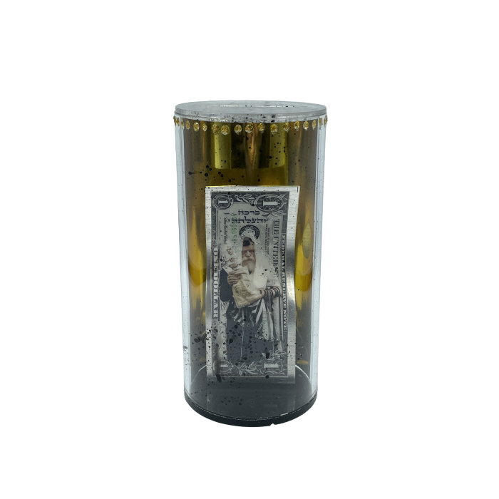 Boite de tsedaka plexiglass avec Dollar du Rabbi 1 Dollar et fond noir, dimensions hauteur 15 diamètre 7cm, Alain Mimouni