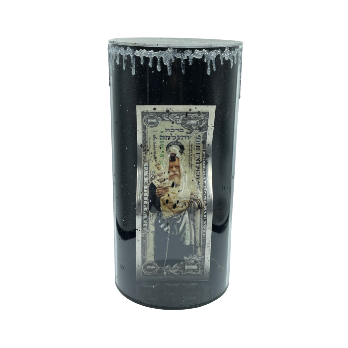 Boite de tsedaka plexiglass avec Dollar du Rabbi 1 Dollar et fond noir, dimensions hauteur 26cm diamètre 13cm, Alain Mimouni