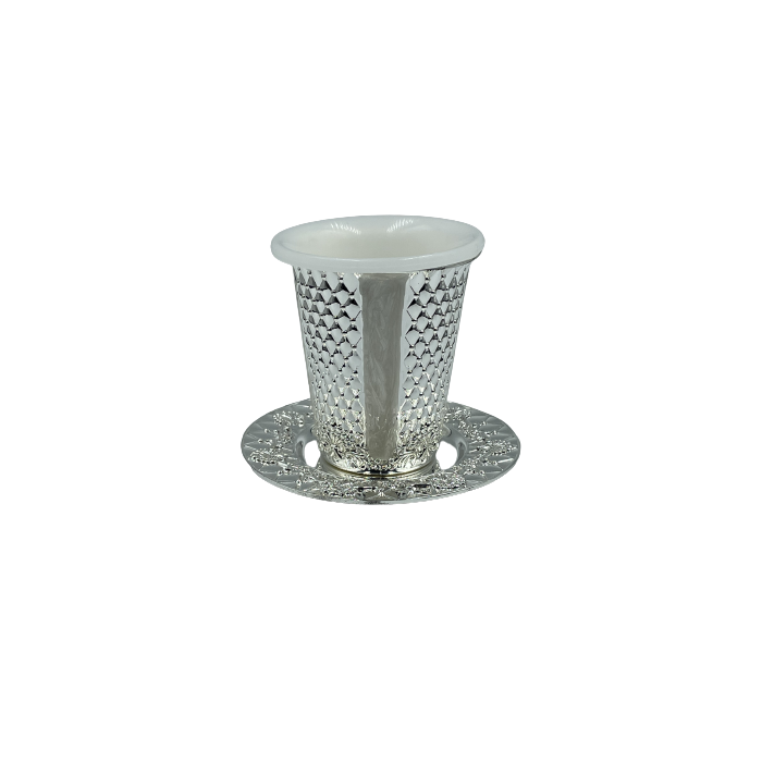 Verre de kidouch à pied et son assiette martelés en inox emmaillé, motif Boré Peri Haguefen.