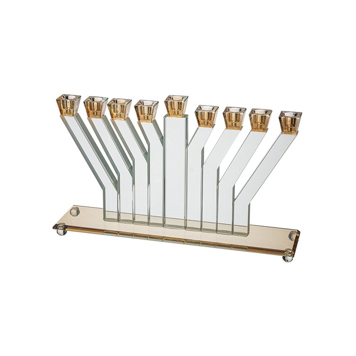 Sublime menorah design en cristal de forme Habad coloris transparent et or. Adaptable aux fioles d'huile Ner Light. Dimensions 33*21cm