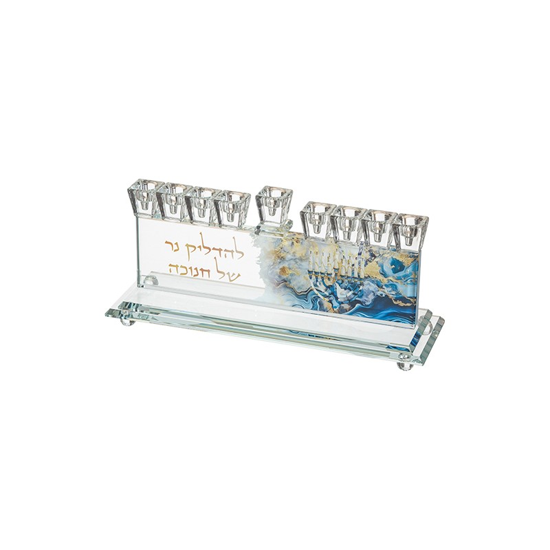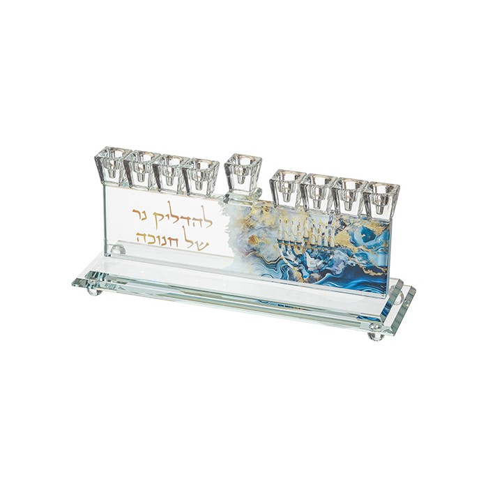 Menorah cristal, base et mur avec plaque aluminium, hauteur 19cm, longueur 30cm.