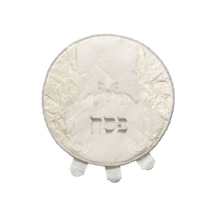 Sublime napperon de matsot en coton et velours blanc et crème, broderie argent. Livré avec sa housse de protection. Diamètre 45cm.