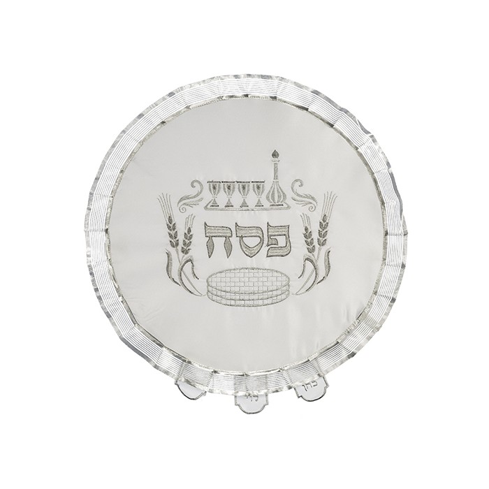 Napperon pour matsot en satin accompagné d'une dentelle et broderie argent. Livré avec sa housse de protection. Diamètre 43cm.