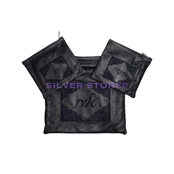 Ensemble composé d'une grande pochette XL et de deux pochettes de tefilines pour Rachi et Rabenou Tam en cuir véritable. Couleur noir. Fourni avec sa bandoulière pour être portée sur l'épaule. Possibilité de broder un nom. Idéal pour hatan. Importé des USA, fabrique PRESTIGE EMBROIDERY.