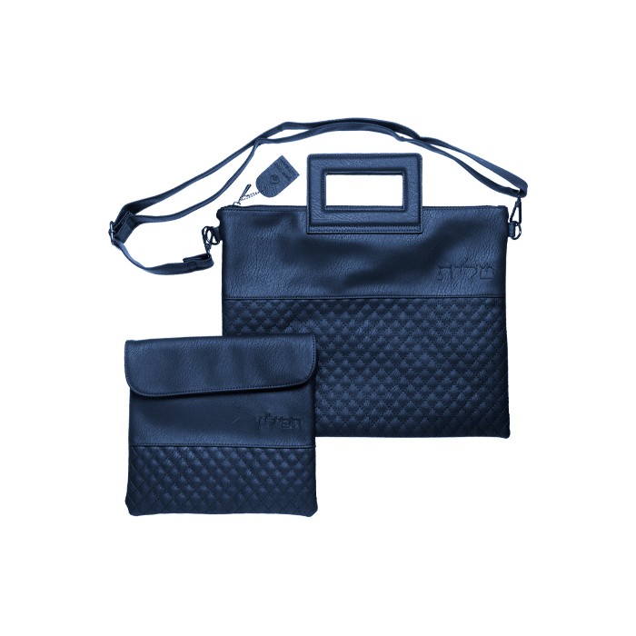 Ensemble de pochettes talit et tefilines en PVC (imitation cuir) bleu marine avec une broderie ton sur ton "Talit/Tefilines". Se porte sur l'épaule grâce à sa bandoulière ou à la main grâce à sa poignée. Dimensions 31/38cm. Livré avec housse de rangement plastique.