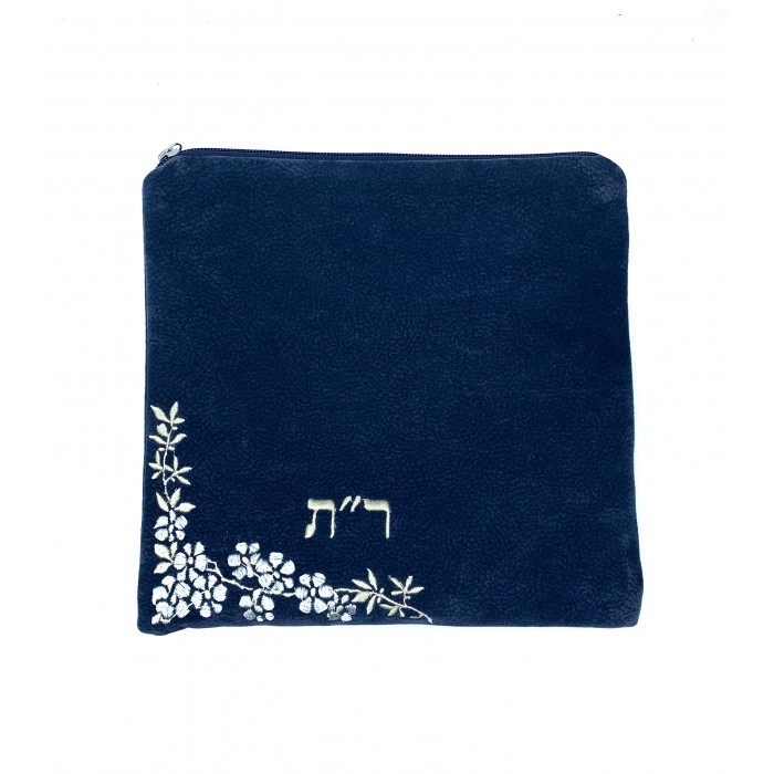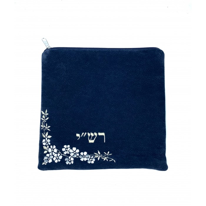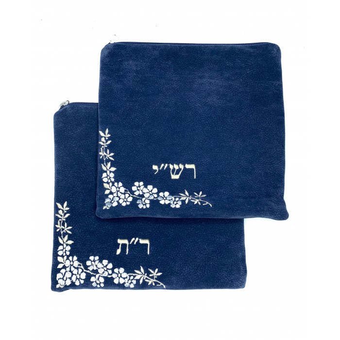 Set de deux petites pochettes de tefilines (Rachi et Rabenou Tam), couleur bleu foncé, motif fleurs, Impala