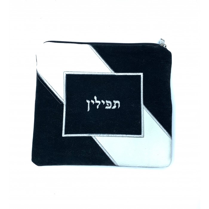 Pochette de tefilines (Rachi), couleur noir et blanc cassé, motif bande diagonale, Impala