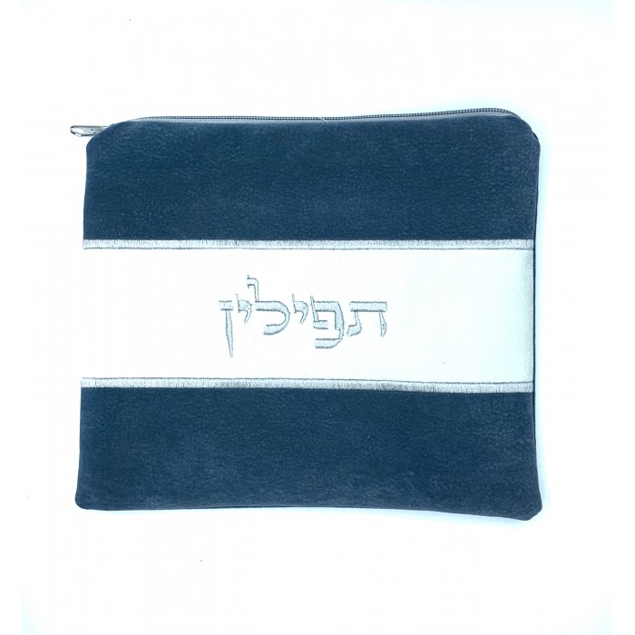 Set de deux petites pochettes de tefilines (Rachi et Rabenou Tam), couleur bleu foncé et blanc cassé, motif cadre, Impala