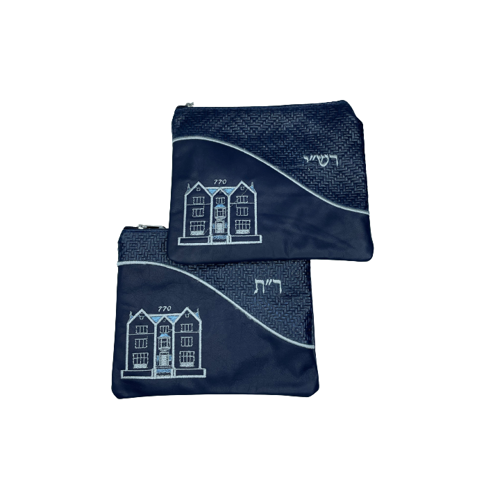 Set de deux petites pochettes de tefilines (Rachi et Rabenou Tam), couleurs bleu et gris, motif 770, cuir véritable. Impala