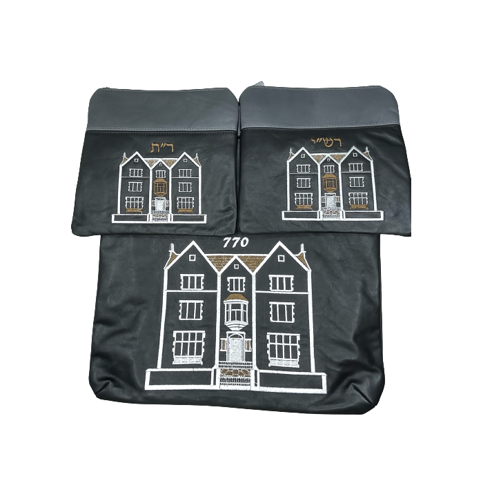 Ensemble composé d'une grande pochette XL et de deux pochettes de tefilines pour Rachi et Rabenou Tam en cuir véritable. Couleur noir et gris. Fourni avec sa bandoulière pour être portée sur l'épaule. Possibilité de broder un nom. Idéal pour hatan. IMPALA.