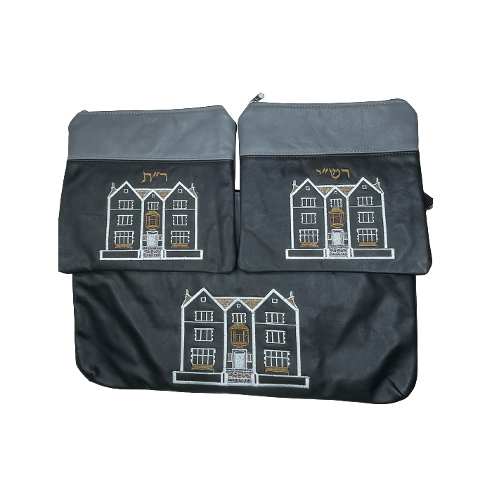 Ensemble composé d'une grande pochette double et de deux pochettes de tefilines pour Rachi et Rabenou Tam en cuir véritable et nubuck. Couleur noir et gris. Fourni avec sa bandoulière pour être portée sur l'épaule. Possibilité de broder un nom. Idéal pour bar-miztvah. Impala.