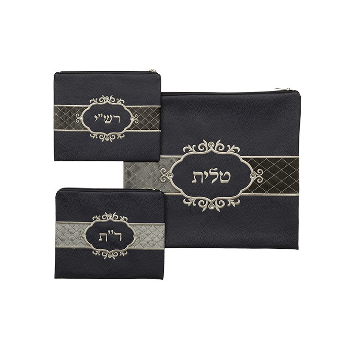 Set pochettes talit et tefilines (Rachi et Rabenou Tam) cuir véritable, couleur bleu et broderie argent, modèle 770. Judaica Leather.