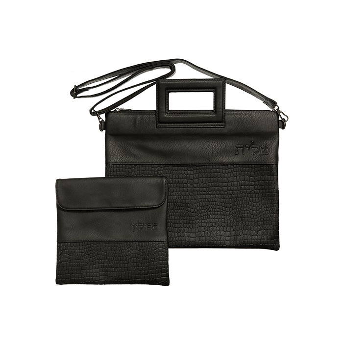 Set pochettes talit et tefilines cuir véritable, couleur noir façon croco. Judaica Leather