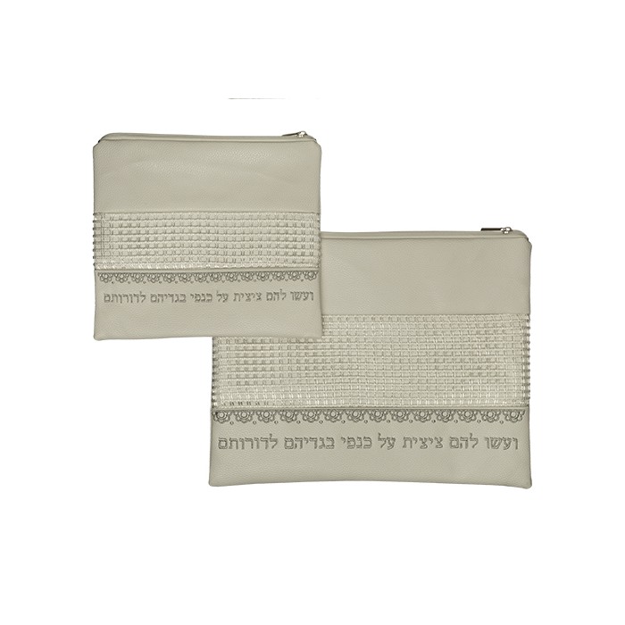 Ensemble de pochettes de talit et tefilines coloris blanc en PVC (simili cuir). Motif bénédiction pour mise du talit. Dimensions pochette talit 29*36cm. Pochette de protection en plastique fournie.