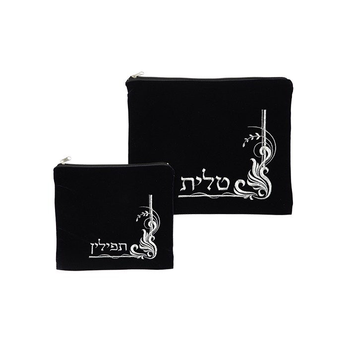 Set pochettes talit et tefilines cuir véritable, couleur noir broderie "Haech Cheli". Judaica Leather