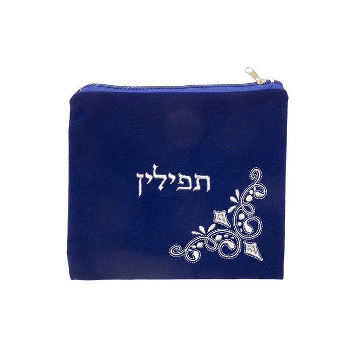 Set pochettes talit et tefilines (Rachi et Rabenou Tam) cuir véritable, couleur bleu et broderie argent, modèle 770. Judaica Leather.