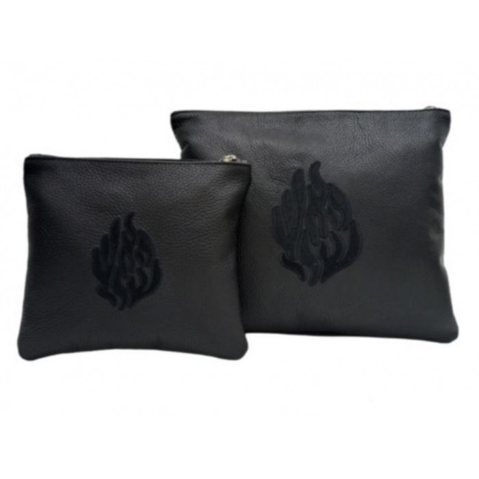 Set pochettes talit et tefilines cuir véritable, couleur noir broderie "Haech Cheli". Judaica Leather
