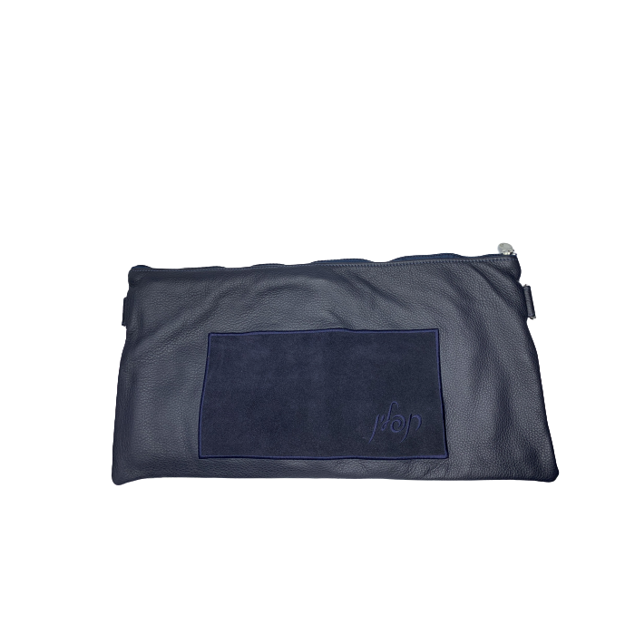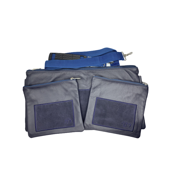 Ensemble composé d'une grande pochette double et de deux pochettes de tefilines pour Rachi et Rabenou Tam en cuir véritable et nubuck. Couleur bleue. Fourni avec sa bandoulière pour être portée sur l'épaule. Possibilité de broder un nom. Idéal pour bar-miztvah. Importé des USA, fabrique PRESTIGE EMBROIDERY.