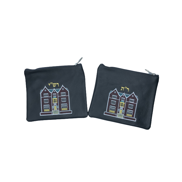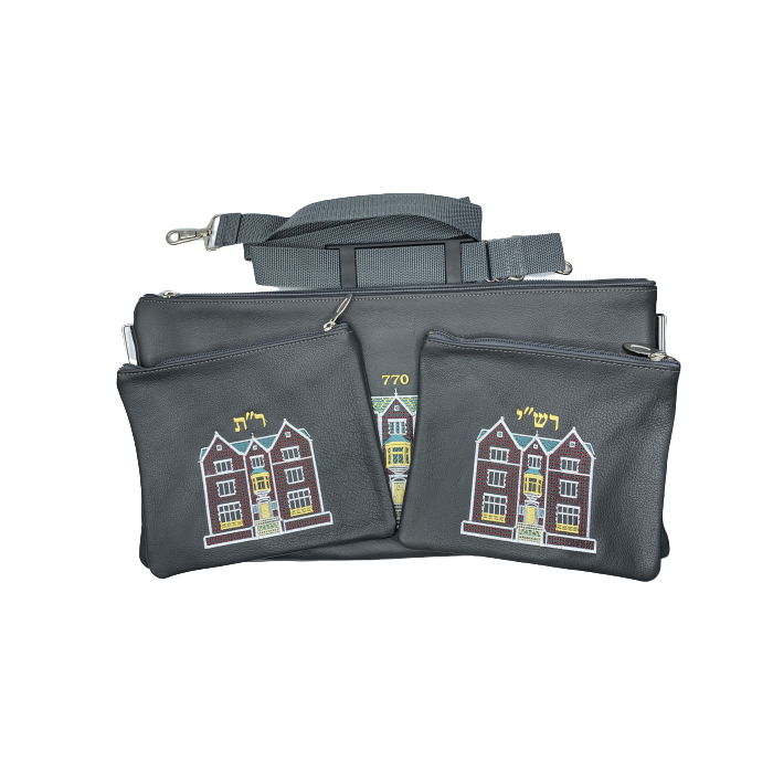 Ensemble composé d'une grande pochette double et de deux pochettes de tefilines pour Rachi et Rabenou Tam en cuir véritable. Couleur noire. Fourni avec sa bandoulière pour être portée sur l'épaule. Possibilité de broder un nom. Idéal pour bar-miztvah. Importé des USA, fabrique PRESTIGE EMBROIDERY.