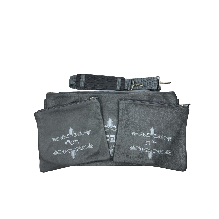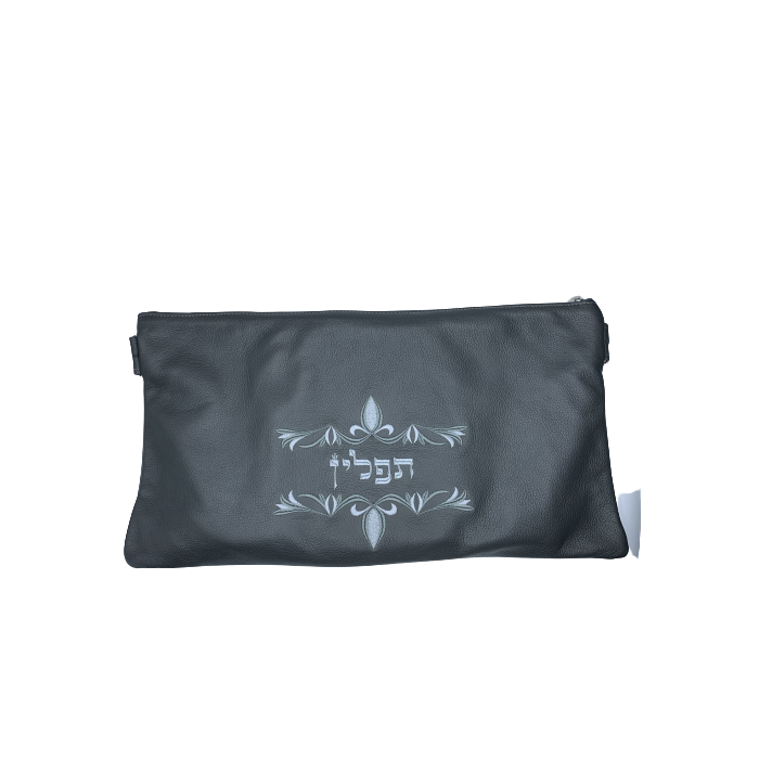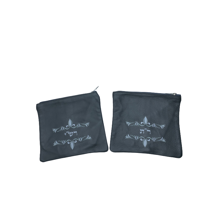 Set de deux petites pochettes de tefilines (Rachi et Rabenou Tam), couleurs noir et gris, motif 770, cuir véritable. Impala