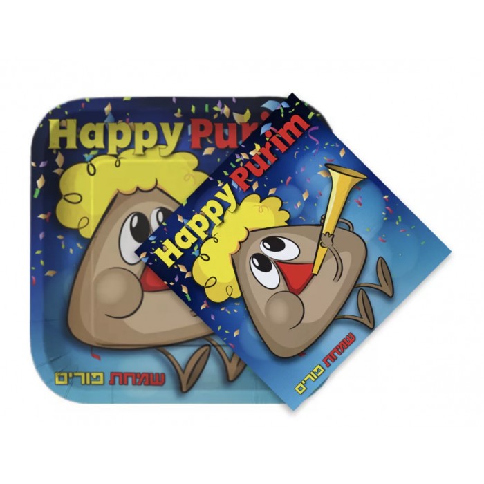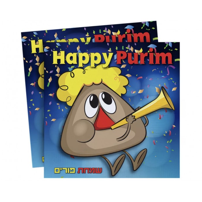 Pack de 20 serviettes papier jetable, motif Happy Purim, coloris bleu. Dimensions 33*33cm. Cazenove judaica.