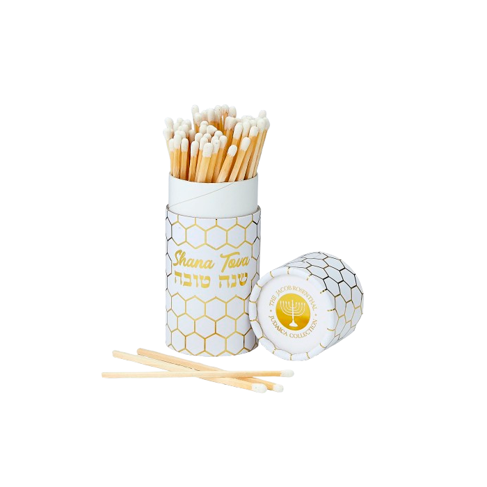 Illuminez le Nouvel An juif avec cette boîte d'allumettes festive ! Ornée d'un motif en nid d'abeilles avec les vœux de « Chana Tova », « Bonne Année », en hébreu et en anglais, elle sublimera la présentation visuelle des célébrations du Nouvel An et promettra de belles fêtes à tous ceux qui allumeront les bougies de cérémonie pour ces jours spéciaux.
