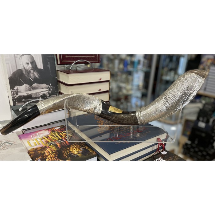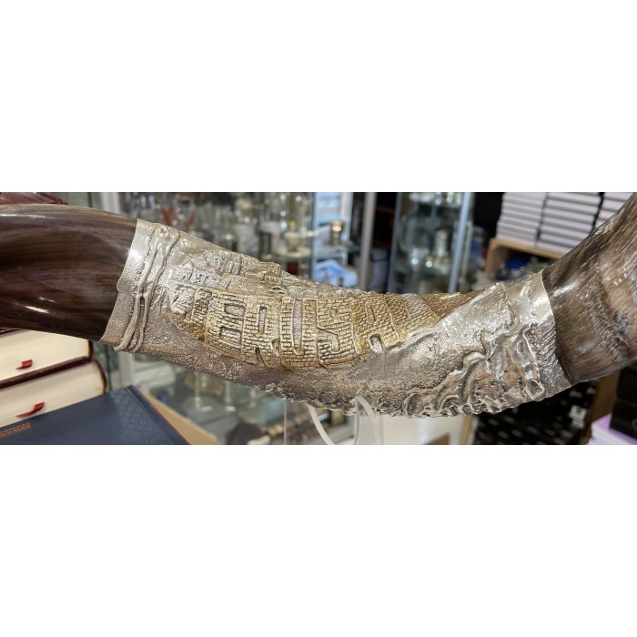 Shoffar corne de bélier type yémenite, fabrication israélienne recouvert d'une couche d'argent motif Jérusalem, longueur 60cm, vendu avec son support en plexiglass.