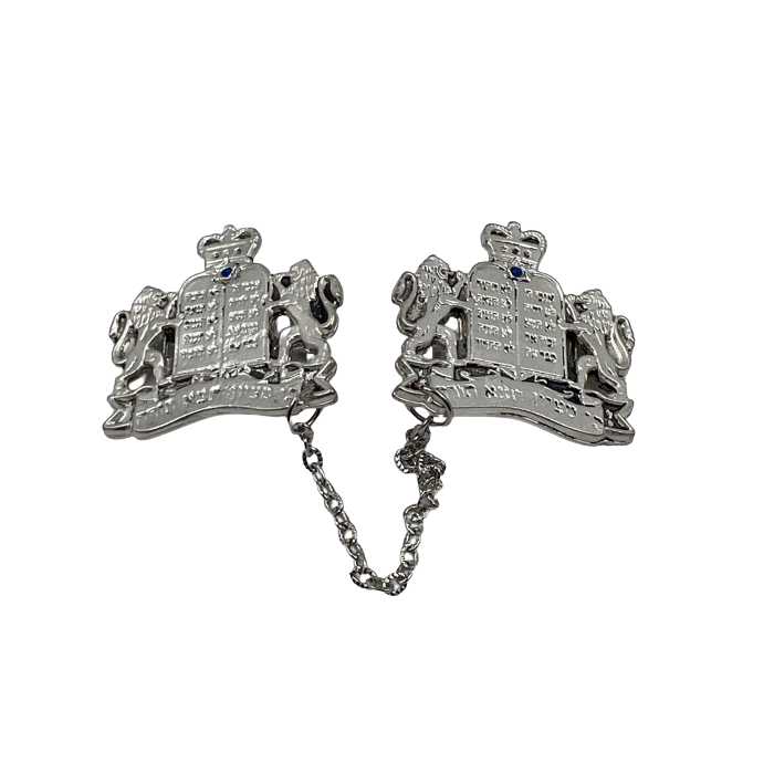 Jolie paire de clips pour maintenir votre talit sur les épaules et éviter qu'il ne retombe. Motif des "Tables de la loi et lions" métal. Idéal pour un cadeau bar-mitsvah
