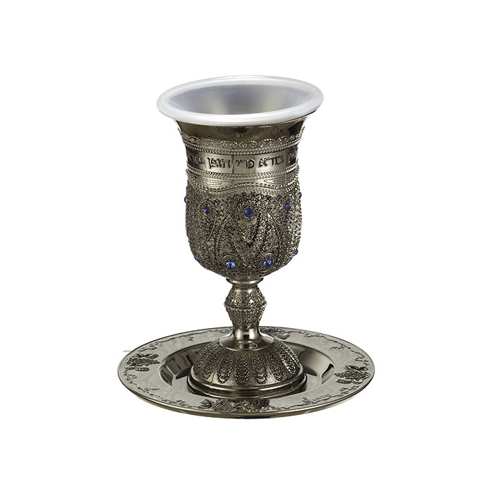Verre de kidouch avec son gobelet de protection en métal brillant design avec motif. Hauteur 9cm.