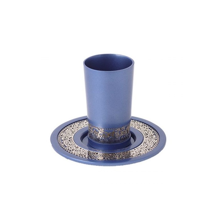 Verre de kidouch à pied et son assiette martelés en inox emmaillé, bande avec inscription Boré Peri Haguefen.