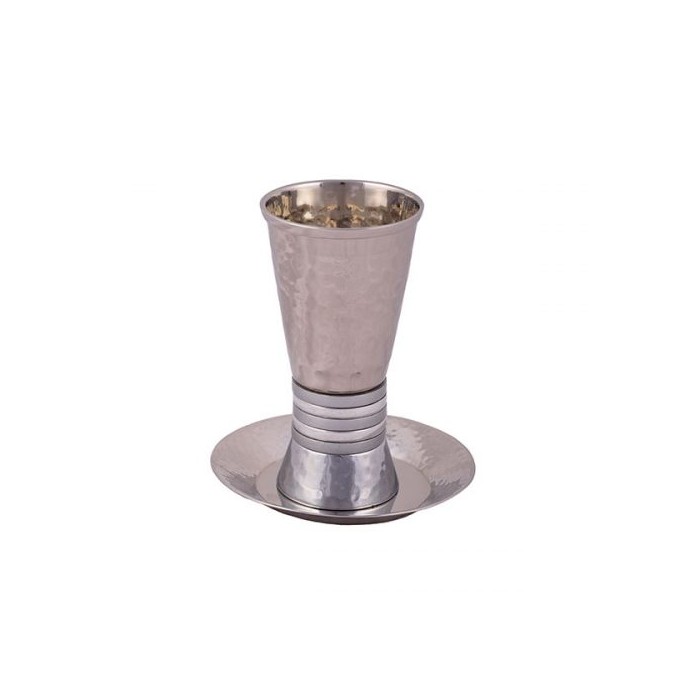 Verre de kidouch à pied et son assiette martelés en inox emmaillé, motif Boré Peri Haguefen.