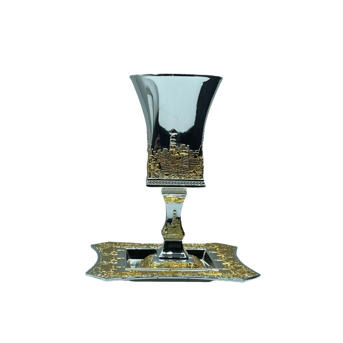 Verre de kidouch et son assiette en inox emmaillé, coloris beige avec motif Jérusalem. Hauteur 8,5cm.