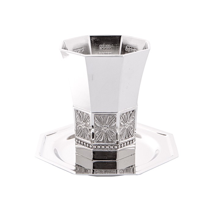 Verre de kidouch en cristal avec pied, ton or, inscription gravée prière du Kidouch. Art Judaica.